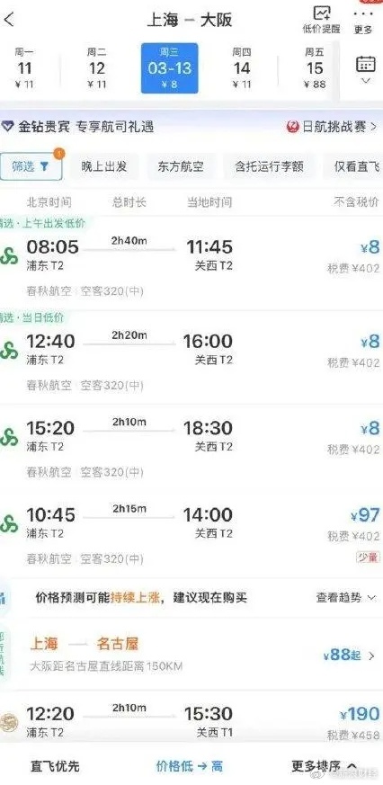近日,有网友发现,购买3月中旬从上海浦东国际机场飞往日本大阪关西国际机场的机票,只要8到11元不等。 据携程APP,8-11元的价格属于不含税价,可以选择的出发日期从2月下旬至3月中旬。以3月13日的机票为例,当日多趟航班的成人票价均仅需8元,加上402元税费后,单人含税总价为410元。3月13日前后几天的票价也仅需11元,加上税费后为400多元。(正观新闻)VVV大手笔网—中国第一文化门户网站